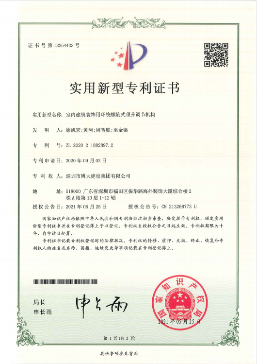 专利成果分别是《室内建筑装饰用环绕螺旋式顶升调节机构》、《一种GRG吊顶安装结构》、《一种PC预制混凝土构件下的特大推拉窗》、《一种带有支撑构件的超大空间顶转换层结构》、《一种单元拼接式铝板吊顶或装饰线条》等22项获得由国家知识产权局颁发的专利证书。
